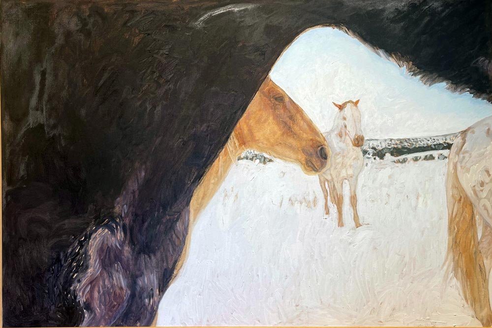 Horses at the End Road is an original oil painting by Susan Hertel, presented by the Hertel Family and Square I Gallery. This expressive piece highlights Hertel’s unique ability to capture the quiet beauty of ranch life through her signature minimal line work and warm, organic compositions. As a rare original painting, it reflects the depth and texture of Hertel’s brushwork, making it a valuable and collectible work of art.
